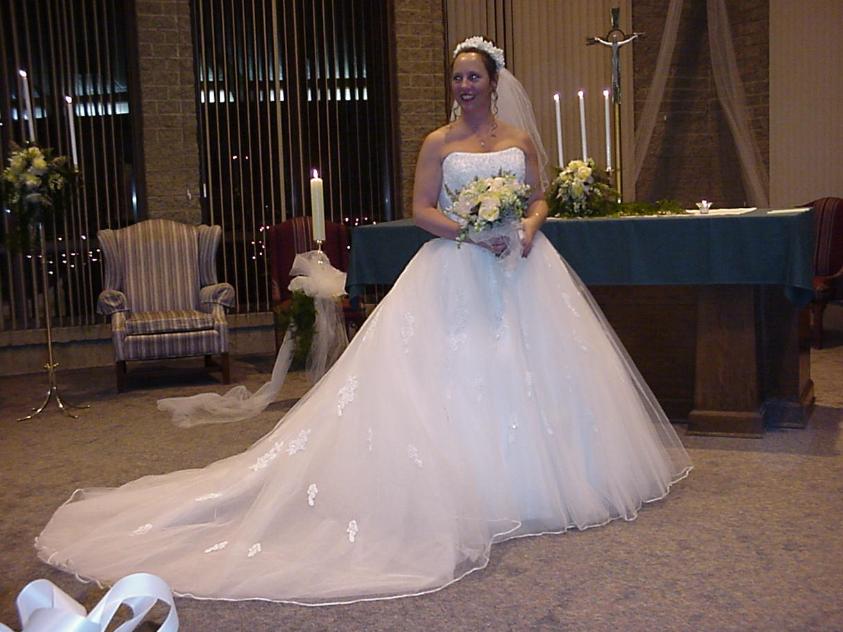 - Custom gown in white satin and tulle, encrusted with handsewn pearls