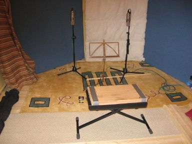 Since the studio live-room was finished, I recorded all of my third CD Reverie On A Hill there, plus some items for future classical guitar solo CD projects. I found that the live room was perhaps too lively for my solo guitar work. Thus, as you can see in the pictures, I installed a few moveable soundboards near the walls and placed a rug to cut down any unwanted reflections.