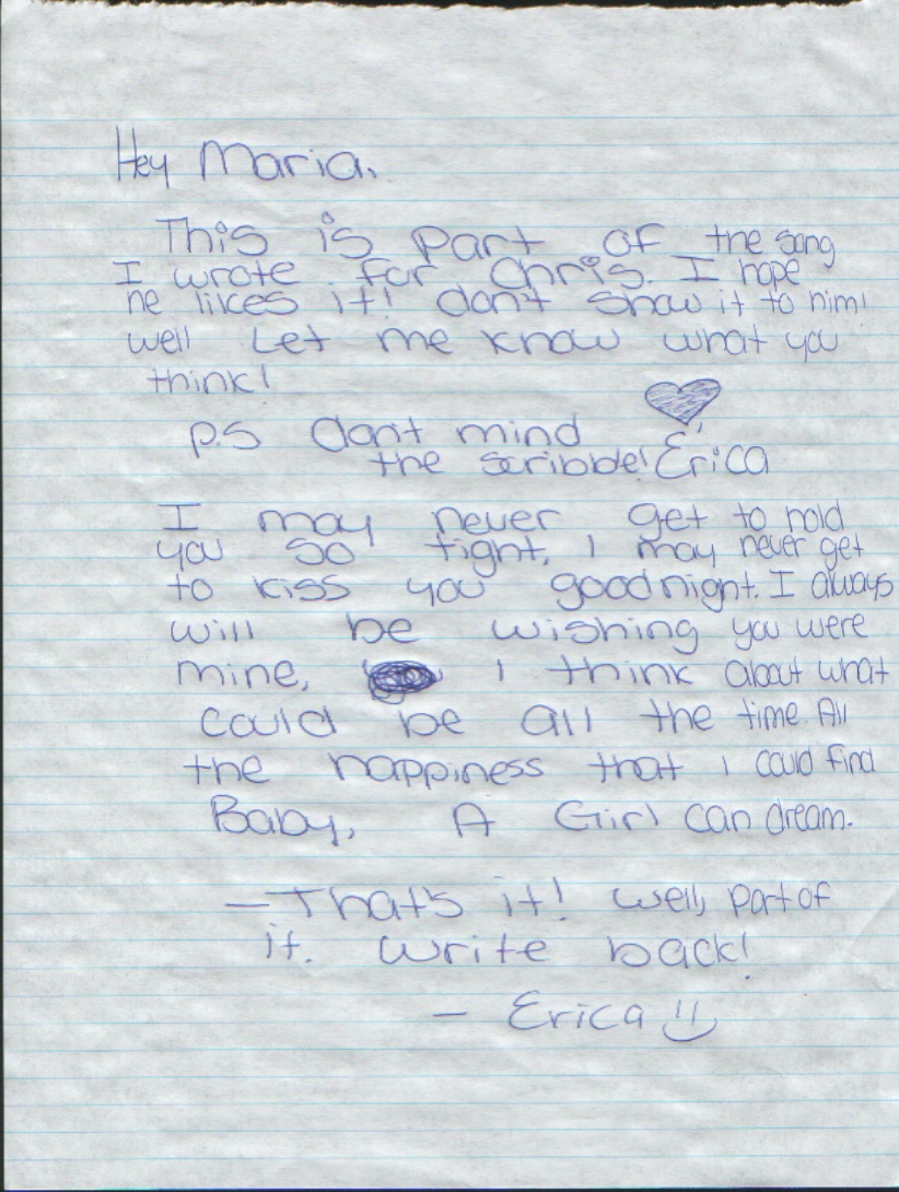 Chris stared at the note. So this is how Erica felt towards him. This is why he could see the hurt and jealousy in her eyes whenever Heather talked to him or even came near him. How could he have been so blind? Chris folded up the note, put it in his pocket and walked into the rehearsal room. He sat behind heather(the only empty seat.) "Hey, I saw Erica ran into on the way out." Heather said to Chris, turning around to face him. Chris looked a little worried. "Yea, do you know why she was so upset?" Heather gave him an innocent look. "No, maybe she’s just in a bitchy mood for no reason." She replied. Chris looked down, "Oh.....ok."