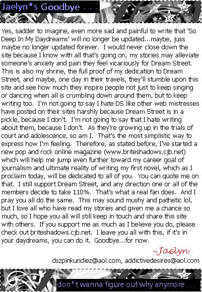 Yes, Yes, It's Feb. 2003 and I'm updating this page AGAIN! I started a New Good Charlotte Fan Fic SIte, and the first chapter of my story is up! So you better check it out and donate pics, fan fics, poetry, graphics, artowkr and sign the guestbook or I'll beat you up! :D.