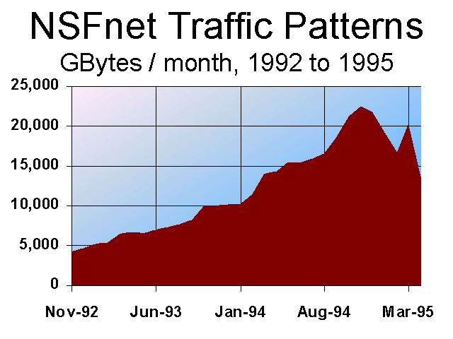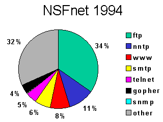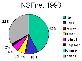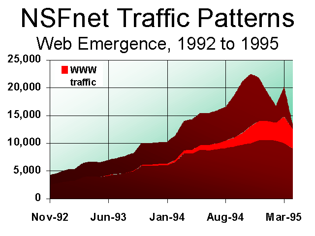 Back at the beginning of 1993, the World Wide Web accounted for only 0.002% of the NSFnet's total traffic. By the end of 1993, it accounted for 2.2%, almost a thousand-fold gain. By July 1994 it had passed SMTP e-mail in total volume and by November 1994, it accounted for 13.9% of the NSFnet's total byte volume. It ended 1994 at 16% for the month of December, and an average of 7.4% for the whole year.