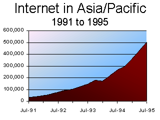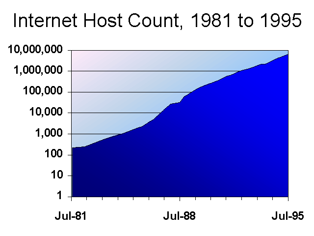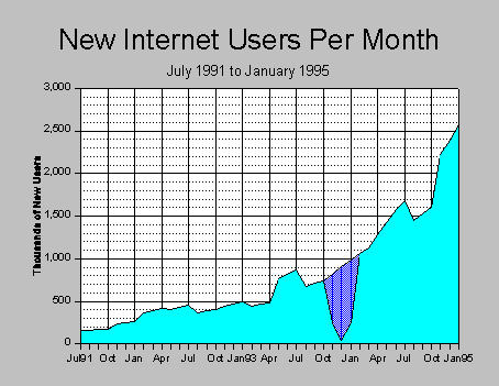 Using 7.5 users-per-host as an average, there were 36.38 million people sharing 4.85 million host computers attached to the Internet as of January 1995. In January 1994, there were 2.23 million hosts on the Internet, and therefore probably 16.7 million users worldwide. Growth in the year to January 1995 was therefore a booming 118%. The annual growth rate for hosts connected to the Internet has ranged between 58% and 92% since 1991.
