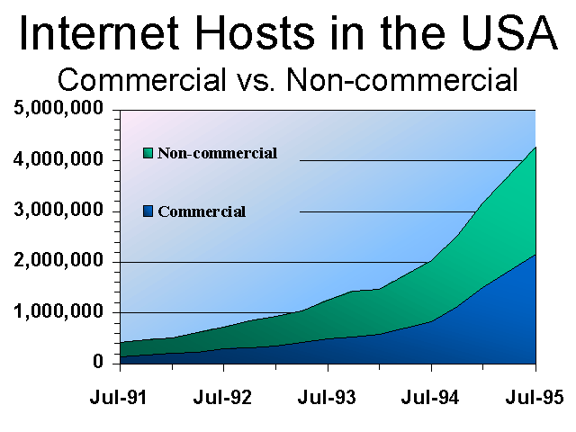 As of January 1995, the split was about 52.7% non-commercial and 47.3% commercial, as close to balanced as it has ever been. In October 1994, the split was 55%/45%, and in October 1992 it was 63%/37%, both heavily weighted towards non-commercial hosts (in the .gov, .mil, and .edu domains). In July 1991, the earliest for which reliable host statistics are available, the split was 66%/34% in favour of non-commercial hosts.