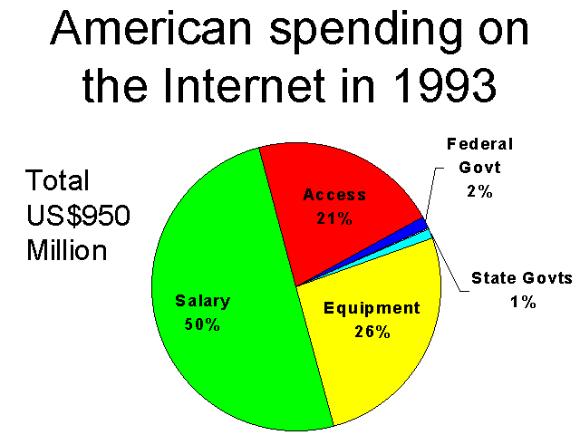 The short answers to these questions are as follows: The operators of each host connected to the Internet must maintain that host locally. They are responsible for the actual end users, and the cost of the computing resources they consume. A network administrator must add and delete users, maintain the disk drives, routers, gateways, and processors, and most important of all, protect the system with security measures. The equipment and personnel needed to complete this task is a major component of total Internet spending. The average corporation or university can expect their annual costs to approximate $53,000 to $63,000 per year for an Internet access link, equipment, and labour. Just the wages and salary benefits paid to local Internet administrators is a phenomenally large amount of money. Assuming that the Internet consumes ¼th the time of a $100,000-per-year skilled network administrator, then the cost of maintaining an Internet connection is $25,000 per year per company. There are currently 34,500 companies and 3,500 universities in the USA connected to the Internet, so just the salary component of Internet costs is over $950 million a year.