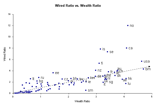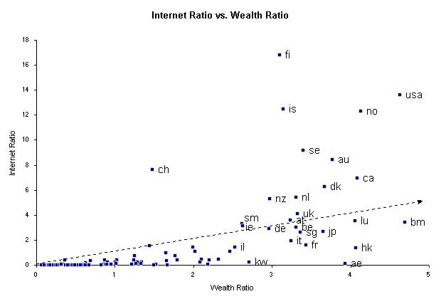 The Wired Ratio was lowest in Ethiopia, Afghanistan, Tanzania, Myanmar, Bangladesh, Mozambique, Sudan, Zaire, Kenya, and Nigeria. Countries very near the worldwide median included Saudi Arabia, Romania, Uzbekistan, and Chile. The Wealth RatioAll countries above the median for Internet usage also were above the median for per capita income (the Wealth Ratio). This suggests that all countries with above-average Internet activity also have above-average per capita incomes. Of course the Internet didn't produce the wealth, but wealth enabled the purchase of a computer, phone line, modem, and subscription, which led to demand for Internet services. However, there are many countries with high incomes where the Internet has not quite caught on yet. There were 21 countries above the worldwide median for Wealth that were significantly below the median for the Internet Ratio. This list includes Saudi Arabia, Oman, Venezuela, Thailand, Trinidad, U.A.E., Argentina, Mexico, Brazil, Bahrain, Uruguay, Chile, Kuwait, Poland, Malaysia, Slovakia, South Korea, Cyprus, Latvia, Malta, and Taiwan. In other words, these countries have high levels of economic activity but currently low levels of Internet activity. Could these countries form the next wave of growth on the Internet, after North America and Europe? They are all countries that have demonstrated their interest in road, rail, phone, and electrical infrastructures, as shown by the other ratios. Perhaps they are the next wave, if one accepts that the Internet arrived early in North America and Western Europe and is arriving currently in the Mediterranean region and in Eastern Europe. Perhaps the Middle East and South America will be the next regions to experience explosive Internet growth. Looking for correlationsThe next step was to compare the Internet Ratio and the other four ratios, looking for correlations. This was done by means of an X-Y scatter plot, with each of the 100 countries represented on a chart by a dot. Inevitably, most of the 100 dots will be clustered near the vertex, but the exceptions will stand out from the pack. The farther to the right and above the (1,1) value a dot is located, the farther that country is above the worldwide median. A dotted line at 45 degrees (allowing for the different scales used for the X and Y axes) was inserted as a visual aid, to show which of the ratios was dominant. The scatter plots reveal that the amount of Internet activity within a country, as measured by the detected number of hosts, domains, and Web pages, does seem to have a strong correlation to the wealth as well as to the energy, communications, and transportation infrastructures within a country. Correlations with road, rail, and population density are much weaker. In general, though, countries with more per capita communications infrastructure also had more per capita Internet activity. The highest correlation of all was found between the Wired and Wealth Ratios (Figure 1). Other strong correlations were found between the Internet and Wealth Ratios (Figure 2), and between the Internet and Wired Ratios (Figure 3). Figure 1. ![]() Graphics by Mark Arnum The countries depicted the farthest to the right in Figure 1 are those with the highest per capita GDP. The countries farthest towards the top are those with the highest per capita distributions of telephones, televisions, and electrical production. The dotted line, though it appears to be much closer to the X axis, is actually positioned along the 45 degree line, because of the unequal scale of the X and Y axes. Countries above the dotted line are farther above the worldwide median for TV, phone, and electrical usage than they are above the median for per capita GDP. In other words, they use these networks at a higher rate than their wealth suggests they would. Norway, Canada, Iceland, and Sweden are notable in this respect. Countries below the dotted line, such as Hong Kong, Luxembourg, and the United Arab Emirates, for some reason have fewer phones, TVs, and electrical usage than their wealth suggests. Most countries, however, are very close to the diagonal, suggesting a correlation between the Wired and Wealth Ratios. As per capita income rises, so does usage of telephones, televisions, and electricity. The correlation in Figure 2 is less strong than in Figure 1. One reason may be the relative youth of the Internet as compared to the telephone, television, or electrical grid. However, even after only a few years of growth, the Internet Ratio is taking on a pattern similar to that found with the Wired Ratio. In future years, it will be interesting to see if the scatter plot for the Internet Ratio begins to mirror the scatter plot for the Wired Ratio. Figure 2. ![]() Graphics by Mark Arnum At present, there are some noticeable differences between Figures 1 and 2. All the dots plotted for the 100 countries have the same relative location along the X axis, but different locations along the Y axis. For instance, Bermuda still has the wealthiest inhabitants, but its per capita Internet usage is a bit below its per capita usage of TVs, phones, and electricity. The countries towards the top of the chart are those with the most per capita Internet usage, as measured by their registration of Internet hosts, their creation of Web pages, and their formation of Internet domains. Finland tops this list, followed by the USA, Iceland, Norway, Sweden, Australia, Switzerland, and Canada. These are countries that have a disproportionate share of the Internet -- not only given their populations, but also given their wealth. The more typical countries are those just above or just below the diagonal, such as the United Kingdom, Ireland, Belgium, Germany, and Austria. Japan, France, and Italy are noticeably below the diagonal. What this means is that these are the countries with the most room to grow, coupled with the means to do so. They have the money required to deploy an Internet infrastructure and to suppo
