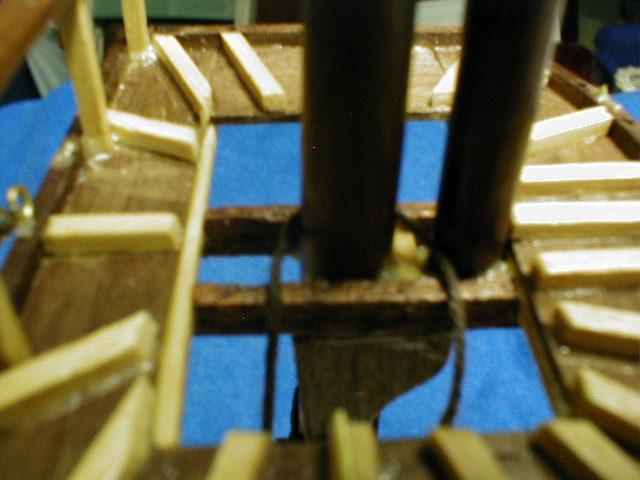 All the fixed rigging should be done before mounting the yards. First pass the rigging line (shroud) under the crows nest and around the main mast. We could go from one side of the ship to the other but that would mean turning the ship around for aech deadeye.