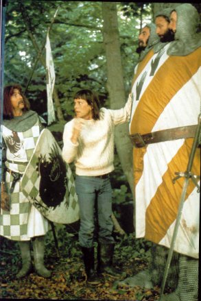 Oh, Terry Gilliam directs Eric Idle. There we go, I was in this shot, but only because Terry Jones was trapped in the body of the three-headed knight (along with Chapman and Michael Palin). So I got to stand around looking like I knew what I was doing. The thing about this scene, strangely enough, is what a wonderful little bit of the forest we were in because all the bluebells were out. It was just stunningly beautiful. Flowers everywhere. In fact, I don't think the giant worked as well as it should've. The body was too crude and rigid. We'd actually trimmed that scene down in the film quite a bit from what it originally was. It was one of the less successful moments. Probably because I was directing it. That's why. That's it.