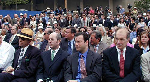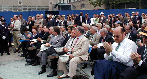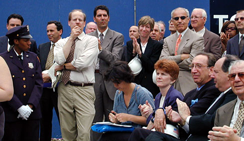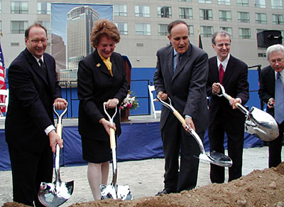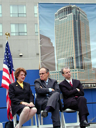 Chief Judge Judith S. Kaye and Mayor Rudolph W.Giuliani and Chief Administrative Judge Jonathan Lippman with the rendition of the new Courthouse in the backround.