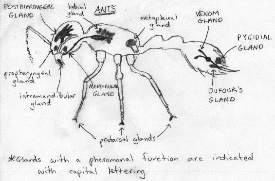Click here for a picture of ant gland location (Picture taken from: Pheromone Communication in Social Insects, 1998, 4)