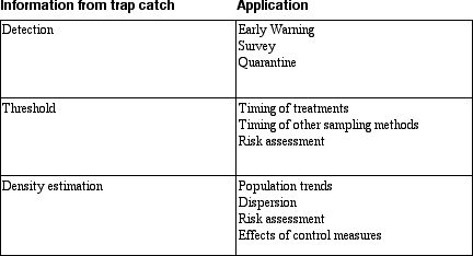 Pest monitoring is used to determine the purpose for which a certain system of pest removal is to be used. Some factors that are considered in these decisions include scientific factors and commercial factors. Other important components of monitoring systems include the attractant source, the trap and where to place it, and sufficient knowledge of the pest biology to interpret the catches. The attractant source is made up of the active ingredient and its controlled release device. The trap design is just the basic structure of the trap itself and it includes designs such as sticky plates, tent traps, wing traps, funnel traps, and milk carton traps. The three important factors of trap placement are its height, position with respect to vegetation, and the trap density. Some applications of pest monitoring traps are listed in the table below. (Insect Pheromones and Their Use in Pest Management, 1998, 263-271)