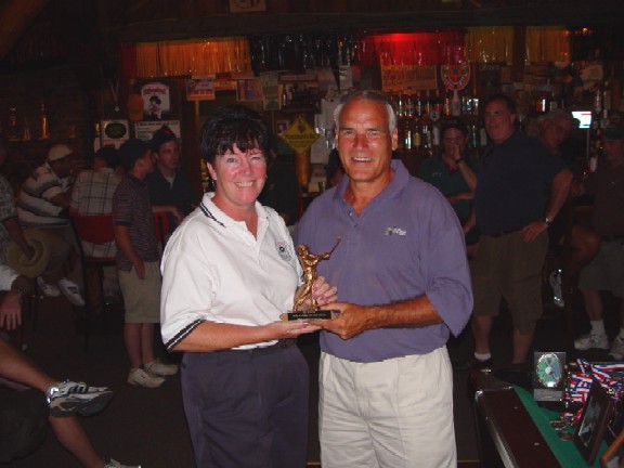 Fran presents the Kelly & Poppa Lou Golf Classic Trophy to the 2004 Champs: Team Whiting-Jones. (missing: Denise & Patrick)