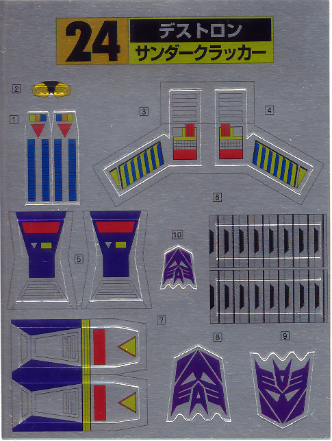 R-2 Pre-Applied Decals/ Stickers: There are 5 Pre-Applied sticker that had been applied onto Thundercracker. The first two are located on either side of the main wing. It's that long red and white strip of sticker. The third and forth stickers are located on either side of the vertical tail fin. It's that red and white sticker. The last pre-applied sticker is the Decepticon Rub Sign logo located just above the cockpit canopy. Sticker Sheet:
