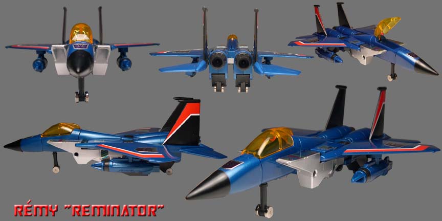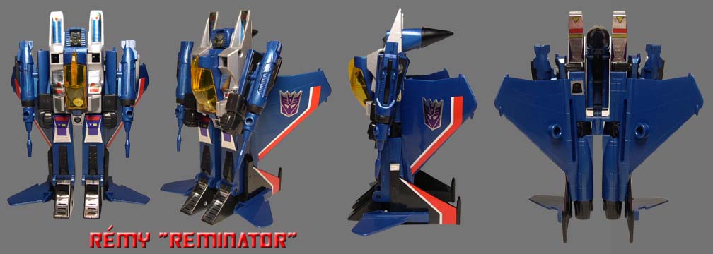 R-6 Rémy's Thundercracker toy review: NOTE: Thundercracker was sold as Exclusive Set w/ Skywarp. Manufacturer - Takara. Line, Series/ Wave: Generation 1 Line, Series: Collector's Edition. Year Issue: [Aug. 2001 Reissue] - The original toy was released in 1984. Made: [China] - Although the original toy was made in Japan, the qualities and materials are pretty much the same as the reissue. Scale: [N/A] Box or Card Dimension In Inches: [LxWxD] - Forgot to measure - Box. Packaging Method: Mint In Seal Box. Contents were packed with the following procedure: Taped down and sandwiched between two clear plastic trays are: " 1" jet body, " 2" main wings, " 2" small rear fins, " 2" small vertical fins, "2" hands, " 2" missile launchers, " 2" long missiles (aka gun), " 2" small missiles, " 1" landing gear, trading card, On the back of the card board and not inside the clear plastic tray, a taped down bag which contained: "1" sticker sheet, "1" instruction sheet, and "1" miscellaneous text sheet. Box Special Note: Front Box Appearance: No art. Back Box Appearance: 1984 Battle Scene Box Art. Box Point or Robot Point: [-- - --] - I forgot to check the box. Approximately Toy Dimension In Inches: Height Up To The Head: 5 1/16 Maximum Height: 5 7/16 (top of the chest air intake) Width from shoulder to shoulder: 2 3/16 Maximum Width: 4 1/2 (from wing to wing) Dept: 3. Toy Stamp/ Fine Print: - © HASBRO 1980 1983, (Japanese text) ©TAKARA CO. LTD 1980 1983, CHINA. Toy Stamp/ Fine Print Location: Can be found on the outside of Skywarp left leg. Transformation Of Difficulty: [Medium] - Average, pretty easy. Material Durability: [-A] - Pretty durable Toy Materials: Die Cast Metal: Chest plate / body, landing gear and his back wheels. Chrome Metal: None. Rubber: Jet Nose. Plastic: Main material. Clear Plastic Window: Cockpit canopy. Stability: [-A] - Robot mode can stand on any surface...but his hands tend to fall off easily. Fun Toy: [-A] - Pretty a fun toy. Negative Drawback: Basically it's just the articulation. Articulations: Head: Cannot be rotated. Shoulder: Can be swung at a 360 degree and a 45 degree backward. Arm/ Elbow: Cannot be bent. Wrist/ Hand: Cannot be rotated, pull hands off to hide hands. Hip/ Waist: Cannot be bent. Leg: Cannot be bent. Knee: Cannot be bent. Ankle/ Feet: Ankle cannot be rotated. Feet however can only bent upward. Rub Sign Logo: [Yes] - The Decepticon's rub sign located on the right side of his jet body, but earlier version does not have the rubsign. Robot's Cartoon looks alike: [-A] - He looks pretty much like the cartoon.. Vehicle's Cartoon looks alike: [A] - Utterly the bomb!!! Very Hot. Special Notes: Here are "2" special notes which I thought you should know: 1 - Thundercracker's missile launcher came with spring so missile can be fired out, check for spring.. 2 - The cockpit can be opened to store his front landing gear. Overall Grade: [A] - Overall, Thundercracker is beautiful especially in jet mode. |