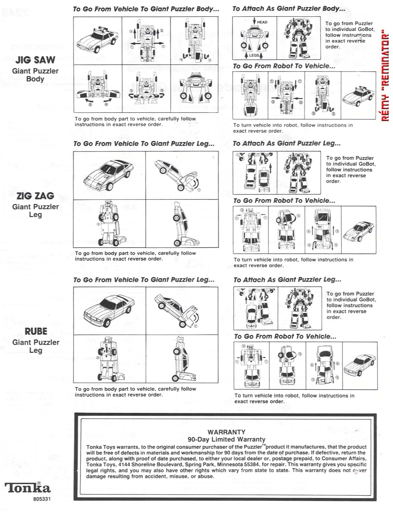 R-3 Pre-Applied Decals/ Stickers: Puzzler came with a total of 7 pre-applied stickers. Here are the stickers break down according to Puzzler's component: Tic Tac - 3 pre-applied sticker. One on the chest and two on either side of the front car hood. Crossword and Jig Saw - each came with 1 pre-applied sticker on the chest. Pocket - none. Rube and Zig Zag - each came with 1 pre-applied sticker on the waist. Sticker Sheet: Unlike the Transformers, none of the Gobots action figure come with sticker sheet. Puzzler's Instruction Sheet: