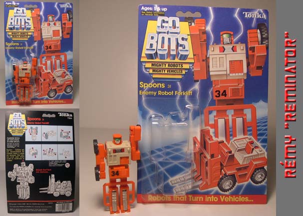 U.S. Name: SPOONS RM Name: FORKLIFT ROBO Cartoon First Appearance: Episode #23: Doppleganger, Season 1, 1984 Comic First Appearance: N/A Toy Catalog Number: MR-34 Gobots Number: 31