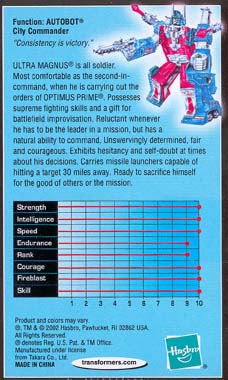 Affiliate: autobots | Subgroup: none | Function: city commander | Alt. Mode: car carrier| | STR 10 | INTL 10 | SPD 10 | ENDN 9 | RNK 9 | | CRG 10 | FRPW 10 | SKL 10 | Motto: "Consistency is victory." Bio: Ultra Magnus is all soldier. Most comfortable as the second-in-command, when he is carry out the orders of Optimus Prime. Possesses supreme fighting skills and a gift for battlefield improvisation. Reluctant whenever he has to be the leader in a mission, but has a nutuarl ability to command. Unswervingly determined, fair, and courageous. Exhibits hesitancy and self-doubt at times about his decision. Carries missile launchers capable of hitting a target 30 miles away. Ready to sacrifice himself for the good of others or the mission. Bio's Source: From the back box of the 2003 Reissue G1 Ultra Magnus toy, see image Tech & Spec on the left. NOTE-2: This 2003 Reissue G1 Ultra Magnus tech spec is exactly as 2001 RID Ultra Magnus tech spec |