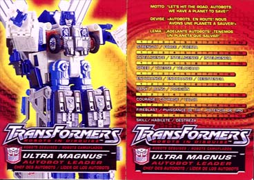 Affiliate: autobots | Subgroup: none | Function: leader | Alt. Mode: car carrier| | STR 10 | INTL 10 | SPD 10 | ENDN 9 | RNK 9 | | CRG 10 | FRPW 10 | SKL 10 | Motto: "Let's hit the road, Autobots, we have a planet to save!" Bio: Ultra Magnus changes into a transport truck and can carry Autobot warriors over long distances at incredible speed. He is a professional soldier loaded with the fierce and fiery weapon, Blue Bolts. He can also fly with his turbo-charged, high-powered jet engine. He and Optimus Prime can joint together to create a super-powerful force of strength and wisdom. Bio's Source: From the back box of 2001 RID Ultra Magnus toy, see image Trading Card above. |