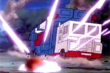 Abilities: Thanks to the structural conversion abilities of the Reconfiguration Matrix, Ultra Magnus is now able to transform into various modes, including his original body, but this "laser rig" mode, created based on the structural formula for Laser Optimus Prime, is particularly outstanding for its comprehensive offensive capabilities. His body consists of two independent modules. The truck cab becomes a robot which is imbued with sentience--this is the part normally recognized as Ultra Magnus. In this mode, his normal form by itself now exhibits power rivaling his original large robot mode, and his quicker mobility gives him full command over a wide variety of hand-to-hand combat techniques. He also has four launchers, which carry a total of 16 rounds, built into his shoulders, from which he can fire short-range missiles with an effective range of 100 km. The tanker trailer section transforms into his battle station module, making a variety of weaponry available to him, including a ripple-fire missile blaster, armor-piercing discs, and a laser-targeting rocket launcher. He primarily remote-controls this equipment via a mind link, but it can also use defense programming to attack automatically, or his fellow Autobots can deploy themselves about it and operate it manually. In vehicle mode, he is armed with a rotatable armor-piercing disc launcher, and he can project powerful energy rams from his headlights that can pulverize their way through obstacles on the road or protective barriers on enemy strongholds. He can also feed energy from his laser core, the nucleus of his life force, into the light saber weapon and laser cannon that are his personal weapons, phenomenally increasing their destructive power.