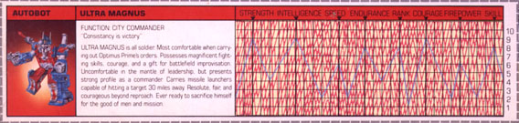 Tech & Specification: Affiliate: autobots | Subgroup: none | Function: city commander | Alt. Mode: car carrier| Ultra Magnus's motto and tech specifications: | STR 9 | INTL 9 | SPD 6 | ENDN 8 | RNK 8 | CRG 9 | FRPW 6 | SKL 8 | Motto: "Consistency is victory." Bio: Ultra Magnus is all soldier. Most comfortable when carrying out Optimus Prime's orders. Possesses magnificent fighting skills, courage, and a gift for battlefield improvisation. Uncomfortable in the mantle of leadership, but presents strong profile as a commander. Carries missile launchers capable of hitting a target 30 miles away. Resolute, fair, and courageous beyond reproach. Ever ready to sacrifice himself for the good of men and mission. Bio's Source: From the back box of 1986 G1 Ultra Magnus toy, see image Tech & Spec above. |