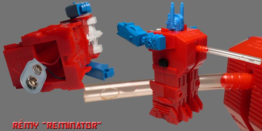 R-5 Rémy's Ultra Magnus E.V.S. action figure review: Manufacturer - Nasta Ind. INC 200 5th Ave, New York, NY 10010 Line, Series/ Wave: Electronic Voice Synthesizer Line, Series 1. Year Released: [1986] Made: [Korea] Scale: [N/A] Box or Card Dimension In Inches: [LxWxD] - Approximately 9 X 6 1/2 X 2 - Card. Packaging Method: Mint In Seal Card. Contents were packed with the following procedure: Inside the sealed card: "1" Ultra Magnus EVS with "1" pre-applied straw. Inside the sealed bag within the sealed card: "2" straws. Box Special Note: Front Box Appearance: Ultra Magnus G1 box art. Back Box Appearance: Instruction of the figure. Approximately Dimension In Inches: Height Up To The Head: 4 1/8 Maximum Height: 4 10/16 (top of the ear) Width from shoulder to shoulder: 2 9/16 Maximum Width: same. Dept: 2 1/8 Figure's Stamp/ Fine Print: ŠNASTA, IND. INC. NY, KOREA. (right side) U.S. & FOREIGN, PATENT PENDING. Figure's Stamp/ Fine Print Location: Can be found on the back of Magnus body. Transformation Of Difficulty: [N/A] - Electronic Action figure. Material Durability: [A] - Pretty durable since it's plastic. Materials: Die Cast Metal: None. Chrome Part: None. Rubber: None. Plastic: Main material. Clear Plastic Window: None. Stability: [A] - Very stable. Fun Figure: [C] - So and so. Negative Drawback - None. Articulations: Head: Can be rotated 2 degree. Shoulder: Can be swung at a 360 degree. Arm/ Elbow: Cannot be bent. Wrist/ Hand: Cannot be rotated. Hip/ Waist: Cannot be rotated. Leg: Cannot be bent. Knee: Cannot be bent. Ankle/ Feet: Cannot be bent and no sideway movement. Rub Sign Logo: [N/A] Robot's Cartoon looks alike: [-C] - Still resembles Ultra Magnus Vehicle's Cartoon looks alike: [N/A] - Electronic action Figure, not a transformable figure. Special Notes: None. Overall Grade: [-C] - Other than for nostalgia, this electronic action figure doesn't really offer much. |