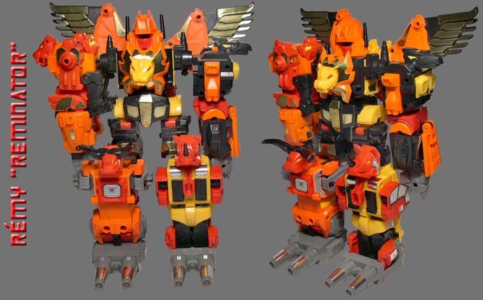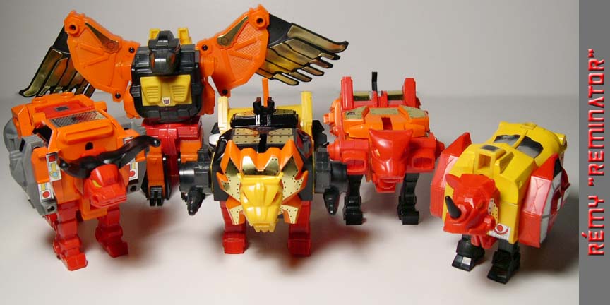 R-9 Rémy's Predaking action figure review: Manufacturer - Takara. Line, Series/ Wave: Generation 1 Line, Series: Reissue Series. Year Issue: [Dec. 2004 Reissue] - The original toy was released in 1986. Made: [China] - Although the original toy was made in Japan, the qualities and materials are pretty much the same as the reissue. Scale: [N/A] Box or Card Dimension In Inches: [LxWxD] - 17 3/4 x 11 1/4 x 4 1/4 - Box. Packaging Method: Mint In Seal Box. Contents were packed with the following procedure: Taped down and sandwiched between two main clear plastic trays are: "1" lion, "1" tiger, "1" eagle, "1" buffalo, "1" rhinoceros, "2" Predaking fists, "2" Predaking feet", and "1" Razorclaw gun. Taped down and sandwiched in clear plastic trays and behind the main plastic tray are: "5" swords, "8" guns (or 4 pair). Behind the clear plastic tray a taped bag which contains: "5" sticker sheets, "6" trading cards, "1" instruction sheet, "1" miscellaneous text sheet, and "1" toy board checklist (Collection/ DW box #0 to #16. Reissue box #01, C-69, C-78, 16S, #22, C-310, C-77, D-98, NY #01, D-77. Binal Tech #01 to #10. And MP-01). Box Special Note: Front Box Appearance: Predacons and Predaking arts. Back Box Appearance: 1986 Battle Scene Box Art with tech & spec beneath that. Box Point or Robot Point: [N/A] - Surprisingly, this Predaking gift set reissue box does not contain any box point or robot point like the previous reissue such as Ultra Magnus. Approximately Dimension In Inches: - Height Up To The Head: 11 Maximum Height: 11 Width from shoulder to shoulder: 9 Maximum Width: 11 (when Divebomb wing is fully spread out) Dept: 6 1/4. Figure's Stamp/ Fine Print: - © HASBRO; 1986; (Japanese text); ©TAKARA CO. LTD; 1986; MADE IN CHINA. Figure's Stamp/ Fine Print Location: - Can be found on each Predacons members. Transformation Of Difficulty: [Easy] Material Durability: [A] - Pretty durable Materials: Die Cast Metal: Pelvis on Razorclaw, Rampage, Divebomb. Shoulder and hip plate for Tantrum. The entire back for Headstrong. Chrome Part: None. Rubber: N/A. Plastic: Main material. Clear Plastic Window: N/A. Stability: [B] - Pretty stable. Fun Toy: [A] - Pretty a fun toy. Negative Drawback - Predaking wing connection is very unstable. Articulations: Head: Cannot be rotated. Shoulder: Can be swung 90 degree forward. Without the wing, he can fully swing 360 degree. On Divebomb arm, Predaking can raise 85 degree sideway. Arm/ Elbow: Can be rotated 360 degree sideway easily on Divebomb side. On Rampage side, you would have to adjust his tiger leg out a little bit. The elbow can be bent about 10 degree with a few adjustment. Wrist/ Hand: Can be rotated at a 360 degree sideway. Also can bent 5 degree inward or outward. Hip/ Waist: Can be rotated at a 360 degree sideway. Leg: Can be bent at a 45 degree forward and 85 degree backward. Knee: Can be bent at a 90 degree. Ankle/ Feet: Cannot be bent and no sideway movement. Rub Sign Logo: [Yes] - All five Predacons have the Decepticons rub sign. Robot's Cartoon looks alike: [+A] - He looks pretty much like the cartoon. Beast Mode's Cartoon looks alike: [N/A] - Same as previous comment. Special Notes: Here are "5" special note which I think you should know: 1 - Inserting the fist into either Rampage and Divebomb can be a hassle sometimes, and if not too cautious, you can easily damage it. Here are my tips: A, Observe Predaking fist carefully, one side of the fist peg projects out longer than the opposite side. Always start off with the long peg side first of the fist. B, Divebomb fist socket has one side flush and one side extrude or push out. Position Divebomb like a "V" shape and begin with the extrude socket side first. Now inserted the fist with the long peg into Divebomb socket. Use force just a little bit to slide the other side in. C, Rampage is a little bit easy since both of his fist socket are flushed. Position Rampage like a "V" shape, now inserted the fist with the long peg into Rampage socket. Use force just a little bit to slide the other side in. D, When taking the fist out of Rampage or Divebomb, always start off with the flush socket first in contrast to step A. 2 - To prevent Predaking wing from falling off too easily, try to position Razorclaw feet in a way so that it can support the yellow part of Divebomb wing. 3 - If you have a hard time inserting or ejecting Tantrum and Headstrong from Razorclaw leg, you must press the little black tab on the side of Razorclaw leg all the way down in order to insert or eject the leg limps. 4 - The arm connection peg from Divebomb and Rampage to Razorclaw shoulder socket are not too durable and strong, so be gentle when you raise Predaking up or down. 5 - Razorclaw, Rampage, and Divebomb all make a clicking sound just like G1 Ultra Magnus shoulder when you move their pelvis, leg, and arm (not on Rampage arm), so check to see that your figure is working properly. Overall Grade: [+A] - Although Predaking colors maybe a little bit too bright or should I say halloween colors, as a G1 figure and combiner, he is definitely one of the awesome G1 figures of all time ranging from nice robot mode, to articulation, to many accessories.