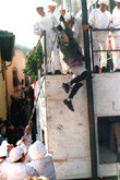 war. Wie ein wildes Tier lief er, dicht gefolgt von einigen Müllern, über den Platz, den Treppenaufgang zum Rathaus hoch, stieg auf das steinerne Geländer und sprang in den großen Kastanienbaum. Das Publikum raunte erstaunt. Der weiße Wagen stand in der Nähe eines dicken Astes, der über den Platz ragte und Haspinger sprang von diesem Ast auf die Brücke. Die dort stehenden Müller waren im ersten Moment zu verdutzt, um zu reagieren und versäumten somit die erste Gelegenheit, Haspinger zu schnappen. Dieser schwang sich über das Gitter, das den Platz auf der "Altweibermühle" begrenzte, hielt sich mit beiden Händen daran fest und knallte mit den ganzen Körper an die Außenwand des weißen Kastens. Er ließ sich fallen und lief den nahegelegenen Treppenaufgang hinauf, die dort stehenden Leute bestimmt, aber doch ohne sie zu gefährden, beiseite drängend. Haspinger wußte, daß dem Publikum nichts passieren durfte es durfte kein Blut fließen, sonst würde die Polizei einschreiten. Fluchend stellte er jetzt nicht nur fest, daß mehr Müller hinter ihm her waren, als ihm lieb war, sondern daß die Treppe in ein Haus führte. Das Haus wurde traditionellerweise als Beobachtungsposten von Besuchern des Umzuges in Tramin dazu verwendet, von den Fenstern aus dem ersten und zweiten Stock das Treiben auf dem Dorfplatz mitzuverfolgen. Dadurch waren glücklicherweise nicht nur sämtliche Türen, sondern auch alle Fenster offen. Obwohl Haspinger kurz darauf gehofft hatte, durch einen Hinterausgang zu entweichen,und einfach zu verschwinden, schienen die Müller diese Aktion vorhergesehen zu haben und trieben ihn in den zweiten Stock. Dort gelangte er in ein Zimmer mit den Fenstern zum Dorfplatz. Die Leute, die bis vor kurzem an diesen Fenstern gelehnt hatten, wichen erschrocken zurück. Haspinger warf einen kurzen Blick aus dem Fenster, kletterte hinaus und schaffte es, bis zum vorstehenden Gitterfenster des ersten Stockwerks hinunterzuklettern. Die Müller, die ihm gefolgt waren, wagten es nicht, es ihm gleich zu tun, machten kehrt und liefen wieder nach unten. Einige wenige Müller wollten Haspinger bereits in Empfang nehmen, doch dieser war flink zum nächsten Gitter geklettert, sprang von dort auf den Boden und überquerte, diesmal laufend, den Dorfplatz. Verzweifelt suchte Haspinger nach einer neuen Fluchtmöglichkeit, aber es bot sich ihm keine. Auch wenn er den Müllern, die langsam wieder alle hinter ihm her waren, in der Menge für eine Zeit lang ausweichen konnte, so würden sie ihn früher oder später zu fassen kriegen. Nach einigen spektakulären Aktionen gelang es ihm schließlich, von einer Rampe aus auf einen der vier Kastanienbäume zu springen, die den Dorfbrunnen säumten. Unwillkürlich begann die Menschenmenge zu jubeln und ihn mit "Bravo!"-Rufen anzufeuern. Die Müller, sichtlich nervös, weil die Jagd schon viel zu lange dauerte, umkreisten den Brunnen. Haspinger war definitiv in einer Sackgasse. Als einige der Müller ebenfalls auf den Baum kletterten, versuchte Haspinger über einen Ast zum daneben stehenden Kastanienbaum zu gelangen. Doch der Ast war zu dünn und Haspinger schaffte den Sprung nicht mehr, zumal ein Müller bereits zu nahe war. Krachend begann der Ast zu brechen und Zenzi samt Müller landeten im kalten Wasser des halbgefüllten Dorfbrunnens. Beob- achter der Szene konnten später nicht mehr feststellen, ob das darauffolgende Lachen der umstehenden Leute den Applaus übertönte oder umgekehrt. Fest steht, daß die Müller ihre Chance nutzten und Haspinger an Armen und Beinen packten und ihn zum Wagen schleppten um das Ritual zu Ende zu führen. Doch Haspinger, der sein Ende gekommen sah, gelang es noch einmal auszubrechen, noch einmal konnte er den Müllern ein Schnippchen schlagen und noch einmal brachte er die Menge zu einem staunenden und gleichzeitig anerkennenden Raunen. Doch schließlich gewann die Überzahl der Müller. Haspinger war zu Tode erschöpft. Erst als er den Gurt, mit dem er hochgezogen werden sollte, um sich spürte, kam er wieder zu sich, wehrte sich erneut äußerst vehement und es dauerte extrem spannende und für die Müller ebenso anstrengende 15 Minuten, bis sie ihn schließlich durch das Loch in das Innere des Wagens werfen konnten. Während draußen tosender Applaus anhob und sich die Müller den Schweiß von der Stirn wischten, lag Haspinger regungslos mit dem Gesicht nach unten auf der Matratze im Inneren des Wagens. Respektvoll ließen ihn die anderen Weiber liegen. Während Haspinger wieder neue Kräfte sammelte, dachte er bereits darüber nach, wie er sich jetzt verhalten sollte. Als plötzlich der Wagen mit einem Ruck anrollte, sah Haspinger eine neue Hoffnung. Bisher hatte ihn niemand erkannt. Niemand hatte noch danach gefragt, wer er sei und wahrscheinlich hielten sie ihn durch seine Kleidung für jenen, der geknebelt immer noch im Gestrüpp weit ab vom Dorfplatz lag. Haspinger wollte sich diese letzte Chance nicht entgehen lassen. Gespannt hörte er auf die Geräusche, die von draußen kamen, versuchte herauszufinden, wann wohl die beste Gelegenheit war, aufzuspringen und den Wagen durch die Seitentür zu verlassen. Als das Gefährt nach wenigen Minuten langsamer wurde und auch der Lärm von angeheiterten Umzug-Besuchern abgenommen hatte, richtete sich Haspinger plötzlich auf, sprang zur Seitentür und verließ unter den erstaunten Blicken der anderen Weiber den Wagen. Einmal draußen, blickte er sich um, sah in die Richtung, aus der der Wagen gekommen war und bemerkte, daß ihm ein Polizist, der eine Kreuzung überwachte, den Rücken zuwandte. Links und rechts von ihm waren zwei hohe Mauern. Ein geparktes Auto nutzend, setzte er über die rechte Mauer, gelangte auf ein Kellereigelände und lief durch die Weinberge Richtung Kurtatsch. Es dauerte einige Stunden, bis der geknebelte Mann gefunden wurde. Nachdem dieser den Überfall bei der Polizei gemeldet hatte, wurde ihnen klar, daß Haspinger nicht nur entkommen, s