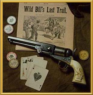 Speaking of the movies, those early Hollywood Westerns crack me up. What is supposed to be taking place during the post-Civil War years depicts everyone running around with Colt "Peacemakers" which weren't produced until 1873. They're also sporting Hollywood gun-slinger type rigs which never existed in the Old West! One of the most accurate representations of what Westerners actually carried is depicted in Crossfire Trail starring Tom Selleck. His side arm is the most advanced and sought-after gun of its day - a Smith & Wesson break-top revolver. I personally got all misty-eyed when, in a gunfight, Selleck pulled out his back-up gun - an old Colt conversion. And do you remember the 50's TV series, Wild Bill Hickok, starring Guy Madison? The only thing historically accurate in that show were the backwards facing guns. Guy Madison packs a pair of shiny, stag-grip 1873 Colts holstered in a fancy rig with backwards left and right holsters. That show also enlightened us with a little known historical fact. Apparently, Wild Bill Hickok palled around with a comedy-relief sidekick named "Jingles" ( Andy Devine). At any rate, the real Wild Bill Hickok carried a matching pair of beautifully engraved 1851 Navy Colts with sculptured ivory handles, which he kept tucked in his belt with the butts facing forward. They were never converted for cartridges. It is interesting to note that when Wild Bill Hickok was murdered while playing Poker in Saloon #10 in Deadwood, SD, 1876 (while holding what has since become known as the "Dead Man's Hand" - aces and eights), He was carrying a Smith & Wesson .32 caliber revolver.