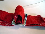 Determine the length of 1 1/2" webbing you need by standing on a length of webbing and raising your hands straight up overhead, holding the webbing in each hand, and then measure and cut that length of webbing. Add a bit more than you feel you need to assure that it is long enough. You can always cut off the excess. In my case, at a height of 5'9", I cut a length sixteen feet long and ended up needing fourteen feet. Singe the cut ends with a flame to seal them and to prevent them from unraveling. Do this with every length of webbing that you cut.