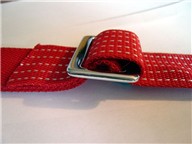 And making quick adjustments is a "cinch" with this iso strap! A cinch is the same mechanism used to tighten the saddle around a horse. You can use either D rings or O rings as seen here. Simply slip the end of webbing over and through as shown, and that's it. Once tightened, it will not budge, and then to loosen it, simply loosen it. It's that easy. Note also, that the belt has been tied around the rings. A slider could have been used, or the belt could have been sewn, but why create more expense or work when you don't have to? And note also that an old martial arts belt makes a great, heavy duty strap.