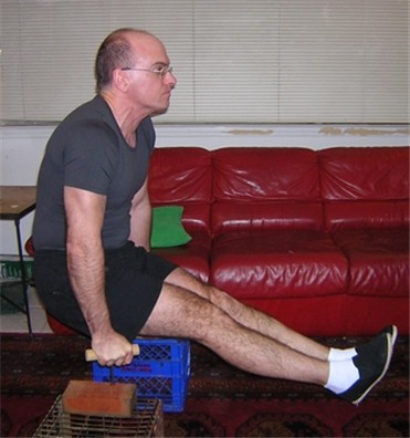 You do it two ways: trying to stand the dowel on its end like a thrust, or more at an angle to simulate the force exerted on a blade bya slash. You can do supports or pushups for reps. One or two hands.