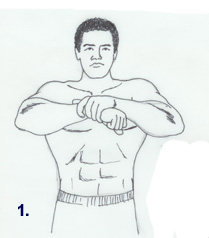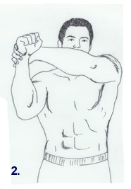 Isometric - This is for the backs of your shoulders. While standing, raise your right forearm so that it is parallel to the floor and bring it across your midsection so that your right hand is touching your left side. Reach across with your left hand and grasp your right elbow. Now attempt to extend your right arm out towards the right while holding it back with your left hand and hold for ten seconds. Repeat with your left arm. |