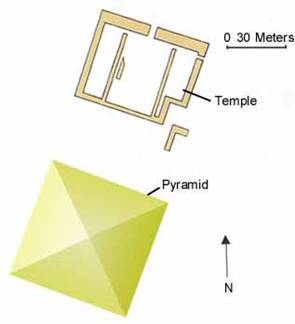 At the southeast corner of the pyramid, a second smaller temple was also discovered that was probably dedicated to Ahmose's sister-wife, Ahmose-Nefertari. The pyramid had a core built of sand and loose stone rubble, which, after having lost most of its outer casing, fell into ruin. Originally, it was probably some 52.5 meters (172 ft) square with a similar or slightly smaller height. Mace estimated, from the remains of two intact courses of casing stones that survived at the eastern base of the pyramid, that its slope measured about 60 degrees...||