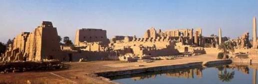 The ruins of the great Temple of Amun at Karnak in Southern Egypt. Karnak is located at 25deg 43min N, 32deg 40min E, east of ancient Thebes. The remains standing at Karnak today are largely the result of the explosion in building activity on the site following the defeat of the Hyksos circa 1550 BCE. Amun, patron God of the victorious Theban princes, became the beneficiary of the spoils of war.