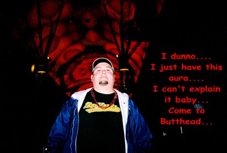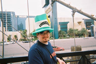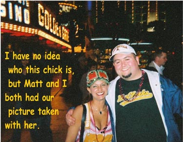 Day Four 3/17 *St.Pattys Day* : I couldn't get Matt outta bed, so I went out adventuring on my own. I walked up to the Venetian, where I'd never been before, and checked it out. I took a tour of the Houdini Museum, which I highly recommend if you like magic. I took a few pictures of the gondelas, but none of them developed. Crappy cheapo camera! It was cool...they dyed the canal green just for St. Pattys Day too. Definately takin the Mav next time! Walked back to the hotel around noon and Matt was still in bed. He finally got up and we went and ate the buffet at the Flamingo. One word of advice, skip it -- wait! That's two words. Save your money. It sucked. Cheesecake was good tho. We walked around some more, and then I went to take a power nap. Hooked back up with Matt later and we headed downtown. I love downtown. They were filming a pilot for NBC while we were down there...pretty cool. We hung out downtown for a while. I had a good time...and I've got proof....sorta...