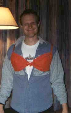 Trogg gives my bra a try in the room with the circular bed and fake fur pillows |