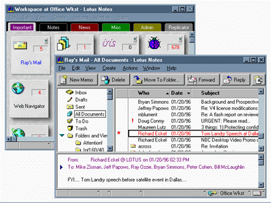 \ A History of Lotus Notes Jump to : | Release 1.0 | Release 2.0 | Release 3.0 | Release 4.0 | Release 4.5 | Release 4.6 | Release 5.0 Release 1.0 The first release of Notes shipped in 1989. During the first year it was on the market, more than 35,000 copies of Notes were sold. With Notes, users could create and share information using personal computers and networks. This first release provided users with a graphical user interface, where they could manipulate information using a mouse. The Notes client required DOS 3.1 or OS/2. The Notes server required either DOS 3.1, 4.0, or OS/2. Back to top of page Release 2.0 The next major release of Notes shipped in 1991. For this release, scalability became the focus. After Release 1.0 sold to large companies, the developers realized that Notes needed to scale to support 10,000 users. Notes was initially intended for small to medium sized businesses. The founders' original vision of Notes did not include large companies as users; they only accounted for about 25 people logging in to one server. The reason for this was that the PC, at that time, didn't have a lot of power. As the PCs and their networks became more powerful, so did Notes. Back to top of page Release 3.0 Notes Release 3.0 shipped in May 1993. By this time Iris had about twenty-five developers working on Notes. Release 3.0 was build number 114.3c. This means it was the 114th successful build of Notes ever, and it took three tries to complete the final build. At the time of the release, more than 2,000 companies and nearly 500,000 people used Notes. The goal of this release was to build further on what Notes already was, but make the user interface cooler, more up-to-date, and evolve it further as a cross-platform product. Lotus began to aim the product at a larger market and reduced the price accordingly. Release 3.0 featured the first of a series of rewrites of the database system, NIF, to try to make the product scale to even larger user populations. This release was suitable for about 200 users simultaneously using a server. Back to top of page Release 4.0 In January 1996, Lotus released Notes Release 4.0. This release offered a completely redesigned user interface based on customer feedback. This interface exposed and simplified many Notes features, making it easier to use, program, and administer. When the developers gave a demonstration of the new user interface at Lotusphere (a yearly user group meeting) they received a standing ovation from the crowd of customers. The product continued to become more scalable. It became faster and faster as companies added additional processors to a multiprocessor server. Lotus cut the price of Notes in half, and thus successfully gained a larger market share. Back to top of page Release 4.5 Lotus changed the brand name of the Notes 4.5 server product to "Domino 4.5, Powered by Notes" in December 1996, and shipped the Domino 4.5 server and the Notes 4.5 Client. Domino transformed the Notes Release 4.0 server into an interactive Web applications server. This combined the open networking environment of Internet standards and protocols with the powerful application development facilities of Notes. Domino provided businesses and organizations with the ability to rapidly develop a broad range of business solutions for the Internet and intranets. The Domino server made the ability to publish Notes documents to the Web a dynamic process. There is no time delay. Back to top of page Release 4.6 Notes Release 4.6 shipped in September 1997. By now Notes contains 5,694,358 lines of code. The focus of this release was personal information integration and management of content from Notes databases, Internet mail, and the Web. The developers added more Internet protocols to Notes. In 1996 Notes had an installed base of 10 million seats and a projected installed base of 18 million seats by the end of 1997. However, by the end of 1997 the install base was 20 million seats, doubling in only one short year. Back to top of page Release 5.0 Now customers can see the newest release of Domino and Notes. With continued Web integration, it is no longer a question of Notes versus the Internet, they have become inseparable. The new user interface for R5 illustrates this by taking on more browser-type characteristics. Notes also supports more Internet protocols. Back to top of page