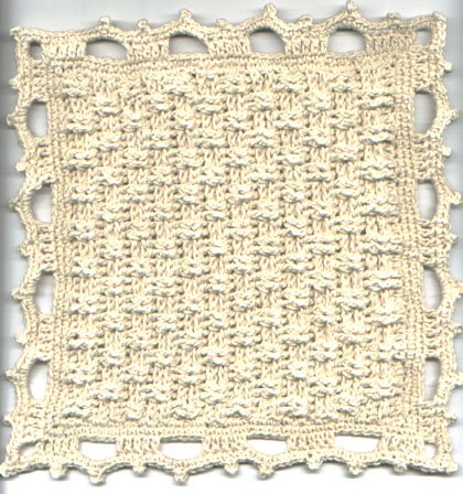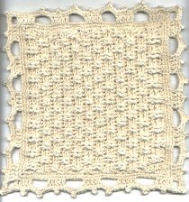 Dimensions: 8.5" Hook used: steel hook nr.4 (2mm) Yarn: 4/2 non-mercerized good quality cotton twain (of course you can substitute for anything that suits you, just adapt the final size). Chain 40. Work 24 rows of basketweave stitch: 1st row: dc across. Ch 2, turn. 2nd row: Skip the first dc, *2 front post dc, 2 back post dc*, repeat from * to *, end with 1 hdc in the last dc. Ch 2, turn. 3rd row: Skip the first stitch, *2 back post dc, 2 front post dc*, repeat from * to *, end with 1 hdc in the last dc. Ch 2, turn. 4th row: Identical to 3rd row. 5th row: Identical to 2nd row. Repeat rows 2 to 5 until you have a square (24 rows). Don't cut the yarn. Border: 1st row: Ch 1, in the top of the last stitch of the 4th row make 1 sc and distribute 40 sc's through the side of the square; 1 sc more in the very corner, 2 ch, 1 sc in the same point, 40 sc, for the corner 2 ch, 1 sc in the same point of the last stitch, and work this way until you made sc's in all four sides. Ch 2, slip stitch in the first sc. Ch 1, turn. 2nd row: Sc, making 1 sc, 2 ch, 1 sc in the ch 2 space of the corners. 3rd row: Ch 3 (counts as first dc), 2 dc, * 5 ch, skip 5 sc, 5 dc*; repeat from * to *, and make the last dc in the corner space; 5 ch and 1 dc in the same space, 4 dc, repeat from * to * until the end of the side; go on like this, making 1 dc, 5 ch, 1 dc in the corners as explained, and end with [1 dc,5 ch, 1 dc] in the last corner, 1 dc, slip stitch in the 3rd ch of the 3 turning chains. 4th row: Ch 1, 2 sc, 1 picot, 2 sc; in all the 5-chain spaces make 3 sc, 1 picot, 3 sc; in all the 5-dc's groups make 3 sc, 1 picot, 2 sc. In the corners make 3 sc, 1 picot, 3 sc. End with a corner, 1 sc, slip stitch in the first sc. Cut the yarn and weave in the ends. |