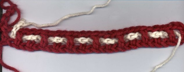 There's been some interest in this lately, so I thought I'd jump in here with a bit of history. If anyone knows where this pattern comes from please let me know. I had an afghan made with this stitch a while back and had to figure the pattern out myself. I've used it for everything from an afghan, to a scarf and even a beach bag (now that was killer, trying to figure it out in the round!!). I'll try and get some pictures of a few of the items I've made and put them up on this website. This pattern is attractive, fun, easy and reversible! To achieve the best effect from this stitch, pick two, highly contrasting colors. In the sample below, I have used worsted weight yarn, Cranberry as the MC, and Aran as the CC. I used an H hook. Row 1 (foundation): With MC, ch 32, dc in 6th ch from hook. *Ch 1, sk 1 ch, dc in next ch. Repeat from * across to the end. Ch 4. Drop loop off hook and lay foundation aside (14 spaces make up the foundation). Row 2: With CC, ch 30. Pick up and hold foundation with ch 4 to the upper right. Taking CC chain, weave it in and out starting from right side and underneath MC foundation, ending with last ch of CC in the middle of last sp in MC foundation. Make sure ch is not twisted and the v�s of the chain are facing you. The picture below shows how it looks from the right side.