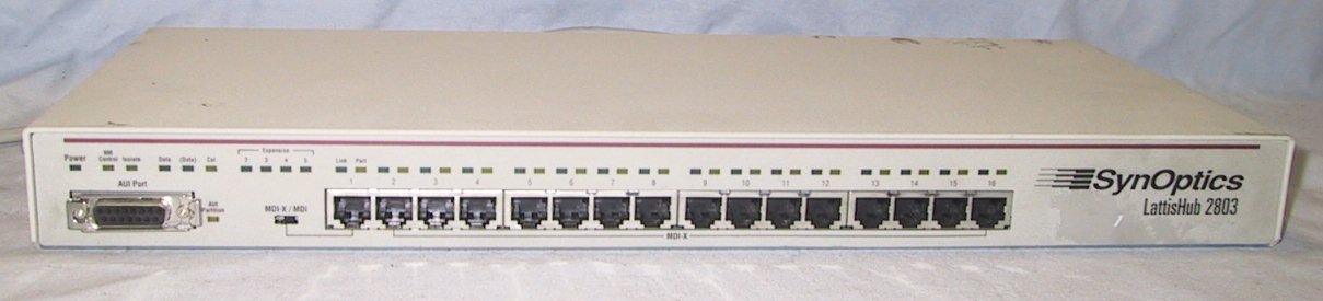 This unit is a Synoptics LattisHub 2803 in used but good condition. It can be rack mountable with the proper hardware (not included). Features a 16 - Port, 1 AUI, 10Base Hub. Compatible with any ethernet network !!