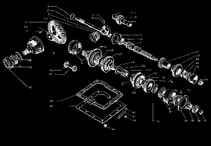 Differentieelhuis is van gietijzer met pakking van tekenpapier. Differentieellagers