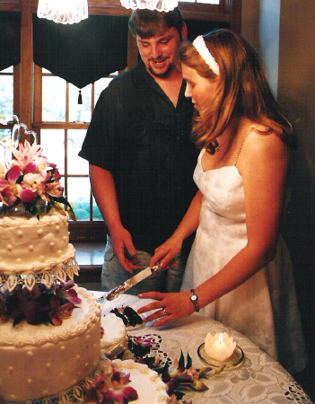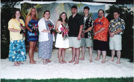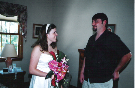 We were suppose to go on a cruise and get married at Magen's Bay in St. Thomas. However, Shaun's dad became ill shortly before we were suppose to leave, and we found out that week that he had brain cancer. As hard as it was on both of us, we knew what we needed to do and we stayed here with him. We started planning to have our wedding on June 1st, 2002 in my parents back yard. Shaun's dad passed away just two weeks before our wedding. Because of our original plans, we made our wedding into a "tropical island" theme, complete with sand and barefeet! It was wonderful!