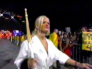 Chastity is one of my favourites in WCW, because she is not afraid to take bumps, as proven by her ECW days when she got dropped on her head regulary by Al Snow. Poor gal, she got hurt a lot because of it, but she still took bumps. Any women who takes bumps is cool in my books. Also she is good friends (They are "siblings" on TV) with one of my favourites, Raven. Also, look at her hair in the first pic. I love it!