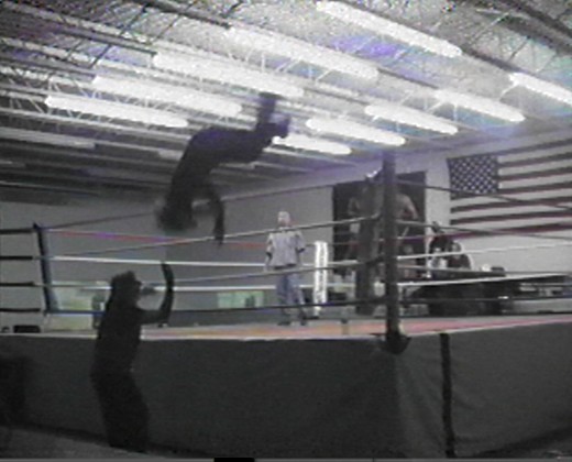 Pogo flips off the top rope to the outside