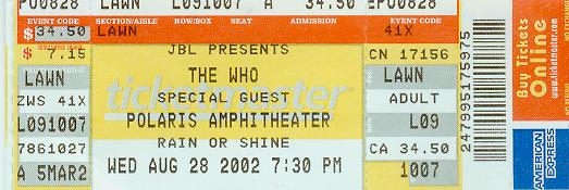 This was an all around spectacular show. I got my dad a ticket for Father's Day and we were both super psyched about the show. When I heard about John's death, I was crushed, I thought that they might not tour again. I was glad to hear that they decided to tour. Anyway, we sat (well stood mostly) in the lawn. Robert Plant and his band opened up and they were amazing. I was impressed with how well these young guys could replicate Led Zeppelin so well. I had heard that Robert's voice was failing, but I was frickin amazed. I felt like I time warped back to the 70's. They played my favorite Zeppelin tune "Babe I'm Gonna Leave You" which made up for the lack of Stairway. The encore was "Whole Lotta Love," which rocked pretty hard. Before The Who went on they played a short video commemorating the life of John Entiwistle. I can't remember the order of any of the songs, but it was amazing. I wish that I owned and had listened to Quadrophenia because they played qhite a few songs from that album of which I was not familiar. It was still an amazing show. There were a few songs that I would have liked to hear, but they did play for about 3 hours I think, so I'm not going to complain. The encore consisted of roughly half of Tommy. That was pretty kick ass cool. All in all, it was an excellent show, I didn't hear one off note and Roger can still do that trademark scream from "Won't Get Fooled Again." The only thing missing (besides the original members) was the destruction of the equipment after they were done, but I guess that comes with maturity. Rock on.
