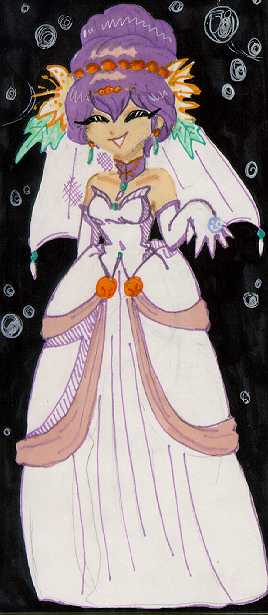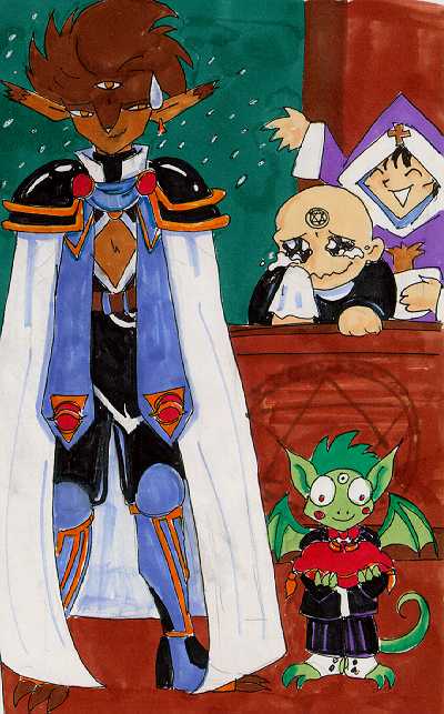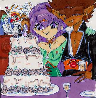 | Aw, Doesn't she look happy? (Even black sorceresses wear white on their wedding day.) | And the groom, of course, looking a little nervous. A lesser demon makes a fine ringbearer when dressed in a tux. |