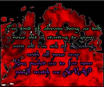 you know what i hate? those damn fwds u get on messenger "if u don't forward you'll have to pay" or "you'll lose your account" "you'll get this or that" ugh ppl.. YOUR MORONS! i hate the e-mails even more BILL GATES IS NEVER GOING TO PAY YOU!!!!!!!!!! AND THERES NO WAY TO TRACE E-MAILS LIKE THAT! you would think they would of learned this years ago from ICQ. Another thing thats been bothering me: we're taking the reality tv shows entirely too far.. today i seen a commercial where they have i think 7? 'sexy single' strangers and if they don't get laid in a week.. they get kicked off and bring new 'sexy single' ppl to replace them.. now we're forcing ppl to be sluts and sleep with total strangers within a week? and have America watch! WOW this is the sort of thing i expect to find on a porn chan not Fox but hey. hey while i'm bitching i might as well throw this in this is gettign on my last nerve - the ppl who decide to stop talking to me because i decide to be with some one whos not over 100 miles away. normally i don't care and i'd say "fuck em" but these ppl i've been talking to FOREVER but i guess i'll still say FUCK EM! I'm done putting effort into just trying to make simple conversation when it never works. i'm sure peoples getting tired of hearing me bitch about these few individuals. why am i so bitchy today? because i havn't seen my 'Mistah J' *harley quinn quote* in 3 fricken weeks and lately hes been the only one whos been capable of calming my happy ass down. not to mention i havn't been able to sleep worth a damn the past 3 weeks.. *grumble* hes such an ass! ah i forgot to share my odd ass computer dream.. two ppl that mean the world to me (one of them my bf and the other a really good friend) were coming over to my moms to hang out - mom was having some sort of get together- and as usual i was avoiding the crowd so i was down by the lake.. but get this i took the fucking computer down to the lake with me, no NOT laptop the whole damn computer this is making me think i have major issues with my computer, ya think?! now how i carried a modem, keyboard, mouse and 19 inch screen down to the lake i don't know.. but i had the net there.. cuz i remember i had to check to see if anyone msgd me.. wow i just got up to get something out of my car and my car is gone.. well it's a good thing i didn't want to go anywhere!xtctiara: WHY is bruce willis the voice for spike on rugrats.. Josh: lol I dunno xtctiara: and the shit spike says i would of never thought that was what spike would say xtctiara: don't they have enough rugrat movies? Josh: yeah I know. I'M FUCKING LOSING IT! earlier i was bitching about my gifs and images i have on this computer that are useless and odd: ie a gif of a woman frying a chicken head, a toe tag, exploding eyeball (used on one of my quotes below)that damn disney thing i have above.. i could go on and on and on and on but i won't.. *your welcome* now i'm going to go again and finish my beer and either write some more or go to bed. I hate you all!