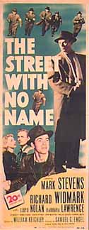 In his next film, 1948’s The Street With No Name, Widmark’s gruesome giggle was more subdued, and his character, Alec Stiles, cooler and more intellectual in his ruthlessness. No longer a mere hit man, he was the leader of a gang infiltrated by FBI agent Mark Stevens. Less heralded than Kiss of Death, the William Keighley directed feature actually holds up better in modern times. Nicely atmospheric, the film was a descendent of 1946’s House On 92nd Street, the film that kicked off Fox’s series of dramas inspired by real stories from the files of the FBI.
