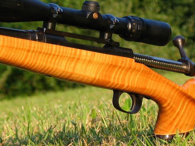"Yeller" is a Savage 110 Sierra Lightwieght chambered in 30-06. It sports a 20 inch featherweight barrel and is set in a Harry Lawson Exhibition grade Curly Maple geronimo stock.