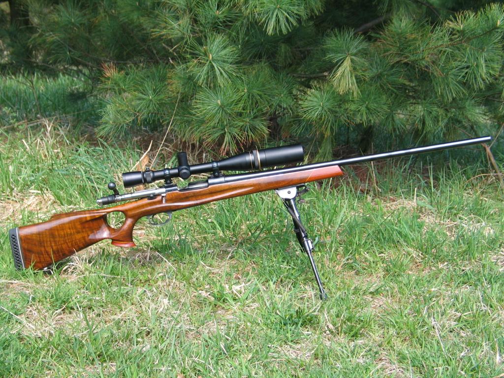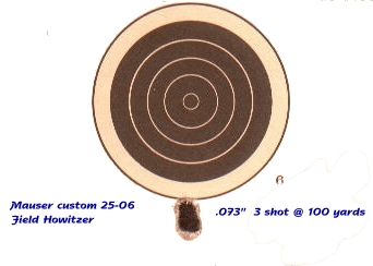 This Mauser 98, my first custom rifle, carries the name "Field Howitzer". It has a Douglas Premium 28" medium heavy sporter barrel, chambered in 25-06. This sits in a Harry Lawson Cochise thumbhole stock in grade 5 fancy American Walnut,with rosewood tip and cap. It is topped off with a Leupold Vari-X III 8.5 X 25 scope. A few of the military parts were replaced with aftermarket components. The bolt shroud and safety was replaced by a streamlined shroud similar to those on the Interarms Mark X's. The trigger was replaced by a Timney featherweight deluxe. The military floorplate was swapped out for a Mark X trapdoor floorplate.
