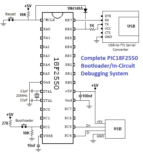 The following schematic shows a minimal PIC18F2550 system capable of running the bootloader and the DBg debugger.